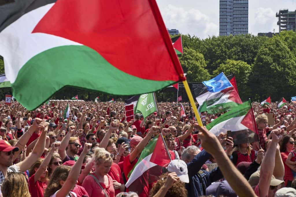 Many demonstrators waved Palestinian flags while chanting slogans like “Stop the Genocide.” They transformed a central park into a vibrant sea of red on a sunny afternoon. Protesters brandished banners with powerful messages such as “Don’t look away, do something,” “Stop Dutch complicity,” and “Be silent when kids sleep, not when they die.” These slogans resonated deeply with the crowd, emphasizing the urgency of their demands.