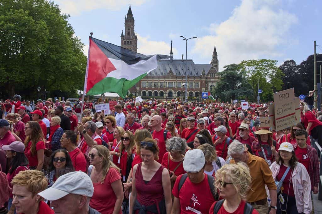 Tens of thousands of people dressed in red marched through the streets of The Hague on Sunday, demanding more action from the Dutch government against what they termed a “genocide” in Gaza. Rights groups, including Amnesty International and Oxfam, organized the demonstration, which stretched from the city to the International Court of Justice, creating a symbolic “red line” to highlight their cause.