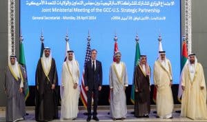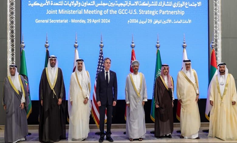 (L to R) Gulf Cooperation Council Secretary General Jasem Mohamed Albudaiwi, Kuwait’s Foreign Minister Abdullah al-Yahya, Qatar’s Foreign Minister Sheikh Mohammed bin Abdulrahman bin Jassim al-Thani, US Secretary of State Antony Blinken, Oman’s Foreign Minister Sayyid Badr Hamad al-Busaidi, Saudi Arabia’s Foreign Minister Prince Faisal bin Farhan, and Bahrain’s Foreign Minister Abdullatif bin Rashid al-Zayani pose for a group picture during a Joint Ministerial Meeting of the GCC-US Strategic Partnership discussing the humanitarian situation in Gaza, at the Gulf Cooperation Council (GCC) Secretariat in Riyadh on April 29, 2024