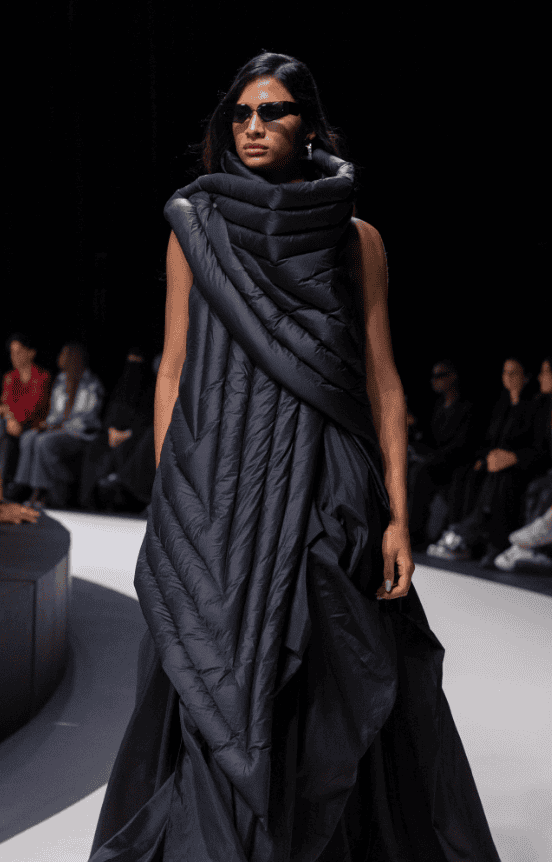The third day also featured a collection for the brilliant Kawthar Alhoraish’s Kaf by Kaf. Titled “Artificial Beauty,” Kaf by Kaf’s Spring/Summer 2025 collection blended technology with nature, highlighting the contradictions between the organic and the synthetic. In a bold move, Kaf by Kaf used a robot model to reinforce the idea of blending fashion and technology.